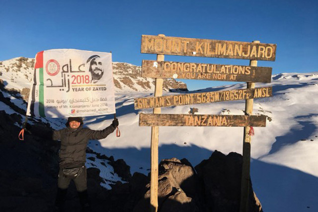 ABU DHABI, 6 de julho de 2018 (WAM) – Um oficial da Polícia de Abu Dhabi (ADP) fez história escalando o Monte Kilimanjaro, a montanha mais alta da África, na Tanzânia, e levantou a foto do pai fundador dos Emirados Árabes Unidos, o falecido Sheikh Zayed bin Sultan Al Nahyan, e o logotipo do Ano de Zayed 2018 na cúpula.