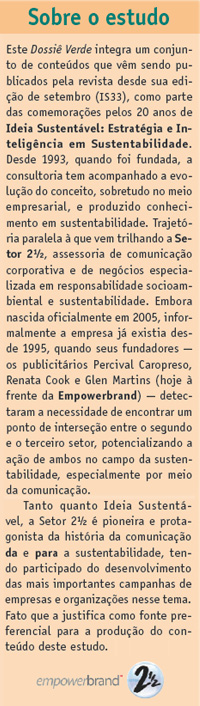 Para entender as transformações que o conceito de sustentabilidade vem sofrendo ao longo das últimas duas décadas, um bom ponto de partida é olhar o modo como as empresas vêm abordando as chamadas questões socioambientais em sua publicidade e comunicação corporativa. Especialmente nos últimos dez anos, a forma de comunicar esses temas mudou radicalmente e abriu caminho para que o próprio mercado publicitário se autorregulasse também quando o assunto é propaganda verde ou socioambiental. Aumentou a vigilância da sociedade, ao mesmo tempo em que o discurso e as ações das empresas foram crescendo em sofisticação. Hoje, não dá mais para apregoar boas práticas sem um trabalho consistente de comunicação. É possível delimitar algumas fases desse processo de transformação do discurso e das práticas de sustentabilidade. Até a década de 1990, as empresas não falavam sobre questões sociais ou ambientais em sua comunicação, muito menos nas campanhas publicitárias. Cabia às organizações não governamentais (ONGs) utilizarem a comunicação e a publicidade para defender suas causas, e mesmo assim o movimento ainda era incipiente. Ficou célebre, em 1987, a campanha da Fundação SOS Mata Atlântica que mostrava a bandeira do Brasil sem a metade de sua porção verde. Reforçando a impressão de que a bandeira estava literalmente sendo desmatada, o slogan: “Estão tirando o verde de nossa terra”. Assinada voluntariamente pela agência de publicidade DPZ, a peça virou uma espécie de símbolo da luta ambientalista que começava a se fortalecer no Brasil. “Até hoje somos lembrados por essa campanha”, conta Marcia Hirota, diretora executiva da Fundação SOS Mata Atlântica. Onze anos depois, em 1998, outra campanha de impacto, desta vez a cargo da agência Young&Rubicam, mostrava duas árvores em posição que simulava os pulmões humanos e a frase: “Quer continuar a respirar? Comece a preservar.”