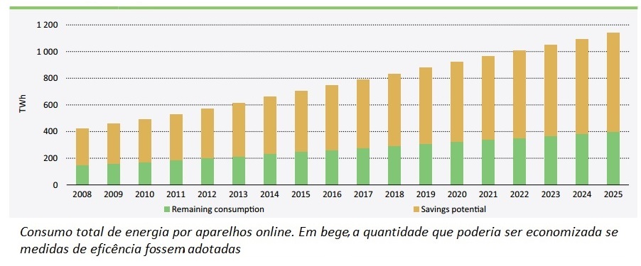 De acordo com o documento, os mais de 14 bilhões de aparelhos “online”, como modems, computadores, tablets, impressoras e novos modelos “inteligentes” de televisores, geladeiras e máquinas de lavar, consumiram em 2013 o equivalente a 616 terawatts hora (TWh). Destes, cerca de 400 TWh foram desperdiçados na função “standby”.