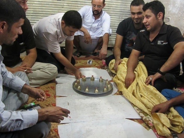 Kirkuk, Iraque, 5/8/2013 – Duas equipes rivais tentam encontrar a azeitona sob um dos 11 copos em cima de uma bandeja, um jogo tradicional que se pratica somente durante o mês sagrado muçulmano do Ramadã. Porém, nesta cidade iraquiana, esse jogo é todo um desafio à morte.