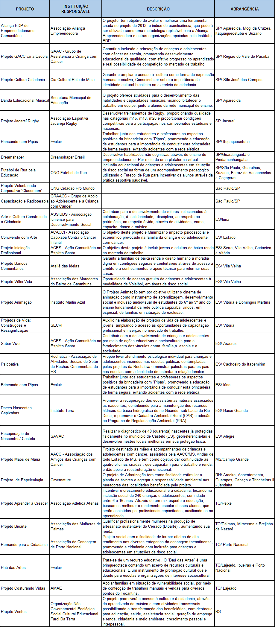 O Instituto EDP (IEDP), organização que coordena as iniciativas socioambientais do Grupo EDP, divulgou a lista de projetos que receberão apoio em 2015 durante a sexta edição do Diálogos EDP Solidária, evento realizado em Vitória/ES, entre os dias 23 a 25 de março e que marca o início de suas atividades no ano.
