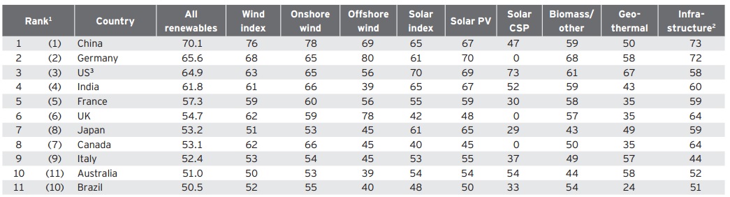 O Brasil, desta vez, não se destacou entre os emergentes, perdendo sua 10ª posição para a Austrália. Entretanto, o relatório salientou que o país continua apresentando boas oportunidades de geração para a biomassa, o etanol e a energia eólica.