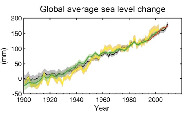 É considerado altamente provável que até o fim do século o nível dos oceanos suba entre 26 cm a 82 cm, causando impactos para cerca de 70% das regiões costeiras do planeta . A elevação entre 1900 e 2012 foi de 19 cm.