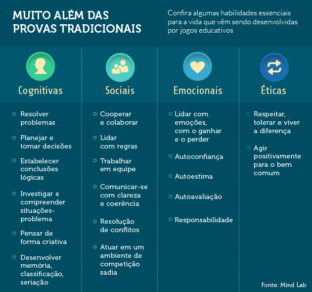 Segundo Claudio Franco, diretor de marketing e de novos negócios da Mind Lab, existem dois tipos de jogos, os de resolução de problemas, em que alunos formam duplas para descobrir a solução de uma questão posta, e os de estratégia, em que um aluno disputa contra o outro. Cada um desses momentos foi elaborado para que os jogadores desenvolvam habilidades que nem sempre o ensino tradicional consegue. “O objetivo final dos jogos é que o aluno seja capaz de transferir o que ele aprende nos jogos para o seu dia a dia. Muito mais do que nas situações tradicionais de aula, os alunos aprendem a não ser impulsivos, a lidar com frustrações – aprendizados muito úteis na vida”, afirma o diretor.