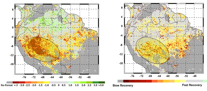 Estudo liderado pela NASA afirma que a floresta está sofrendo com a escassez de chuvas e que já é possível visualizar alterações na região em imagens de satélite que podem indicar uma transformação do ecossistema em longo prazo. Em 2005 a Amazônia passou pelo que foi batizado de “a seca do século”.