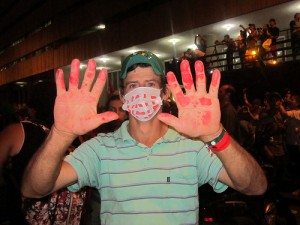 Agricultor assentado da reforma agrária em Atalaia, no estado de Alagoas, Joelson Melquiades, protestou contra os agrotóxicos com uma mascara de proteção da boca e nariz, como muitos dos manifestantes. Sua roça de macaxeira, feijão, inhame e hortaliças, seguindo as orientações da agroecologia, sofrem a contaminação dos venenos agrícolas. Por isso ele e seus vizinhos condenam a monocultura da cana de açúcar presente nos arredores. Economia verde, em discussão na conferencia oficial da Rio+20 é “pura enganação”, sentenciou.