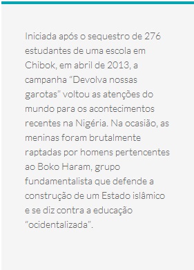 Iniciada após o sequestro de 276 estudantes de uma escola em Chibok, em abril de 2013, a campanha “Devolva nossas garotas” voltou as atenções do mundo para os acontecimentos recentes na Nigéria. Na ocasião, as meninas foram brutalmente raptadas por homens pertencentes ao Boko Haram, grupo fundamentalista que defende a construção de um Estado islâmico e se diz contra a educação “ocidentalizada”.