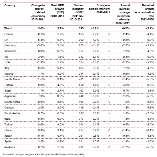 Consultoria aponta que a intensidade de carbono na economia mundial só foi reduzida em 0,7% em 2011 e que se essa taxa não for elevada para 5,1% ao ano pelas próximas quatro décadas ultrapassaremos em muito a temperatura máxima recomendada por cientistas.