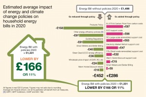 Na semana passada, o governo divulgou um relatório argumentando que, enquanto algumas políticas do pacote de medidas focadas no setor energético e nas mudanças climáticas adicionam custos às contas de energia, outras levam a reduções. A estimativa é de que em 2020 os cidadãos britânicos economizem 166 libras, ou 11%, com essas medidas em comparação ao cenário se elas não existissem.