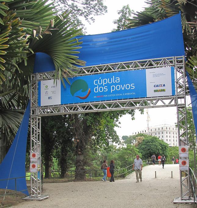 Faixas com dizeres de protesto estão expostas por todos os cantos da Cúpula dos Povos. Aliada à elas é frequente que alguém grite palavras de ordem.