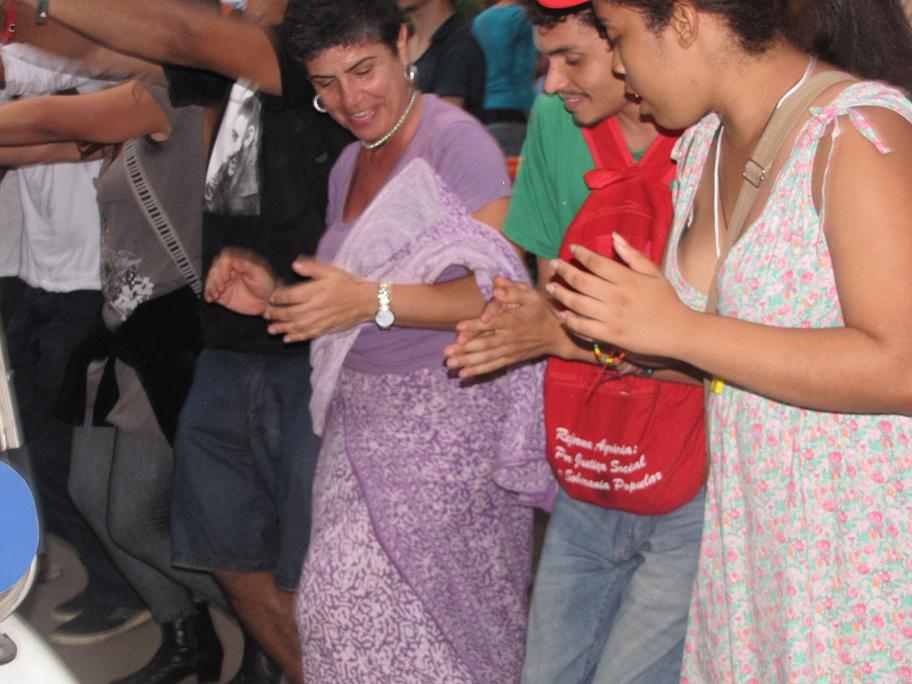 A alegria da música hare krishna contagia um grupo de pessoas que dançam animadamente convidando todos os que passam a participar.