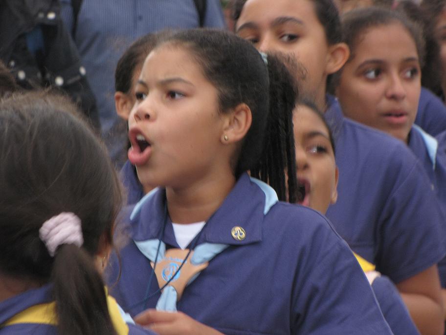 Um grupo de escoteiros canta em coro sua música que fala de fraternidade.