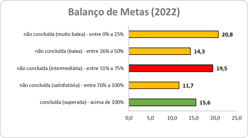 Mesmo dentre as metas que já tiveram a implementação iniciada, o nível de conclusão ainda é muito baixo (até 25% de realização). O gráfico abaixo, produzido pela equipe da Rede Nossa São Paulo, sintetiza a execução do Programa até dezembro de 2022.