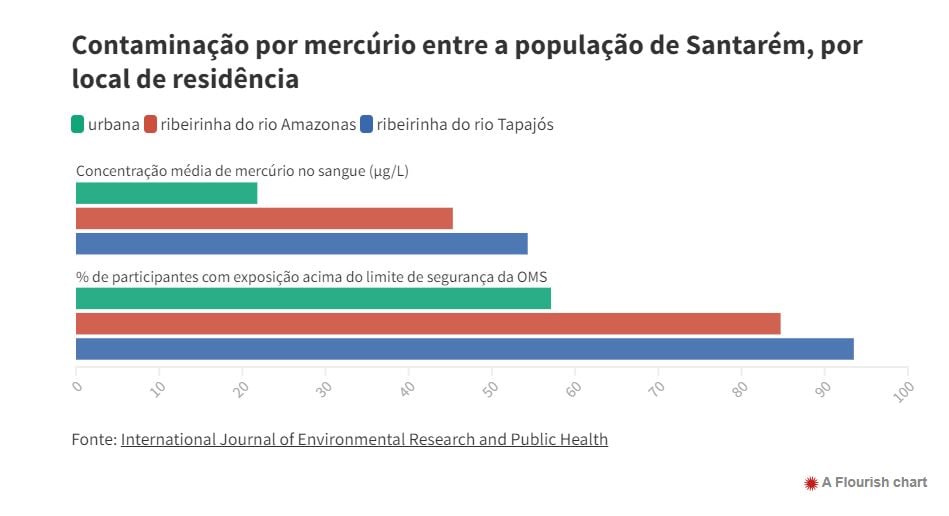 Pesquisa inédita indica que, mesmo a cerca de 300km dos garimpos ilegais do rio Tapajós, mais da metade dos moradores da zona urbana de Santarém apresenta níveis de contaminação por mercúrio até quatro vezes superior ao limite recomendado pela OMS. Entre os ribeirinhos, a contaminação chega a 90%.