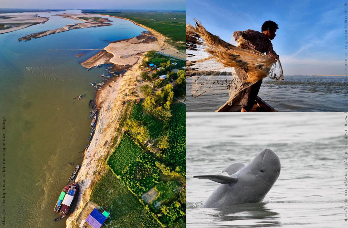 Por último, chegamos em Mianmar, no sudeste asiático, onde até hoje se observa de forma ativa e frequente a pesca cooperativa entre pescadores artesanais de tarrafa e uma espécie de golfinho endêmica dessa região, conhecida como golfinho-do-Irrawaddy ( Orcaella brevirostris ) . Essa espécie recebeu o nome do rio Irrawaddy, onde ela aprendeu a pescar de maneira mutuamente benéfica com os pescadores . Atualmente ameaçados de extinção, vivem menos de 70 indivíduos no rio Irrawaddy.