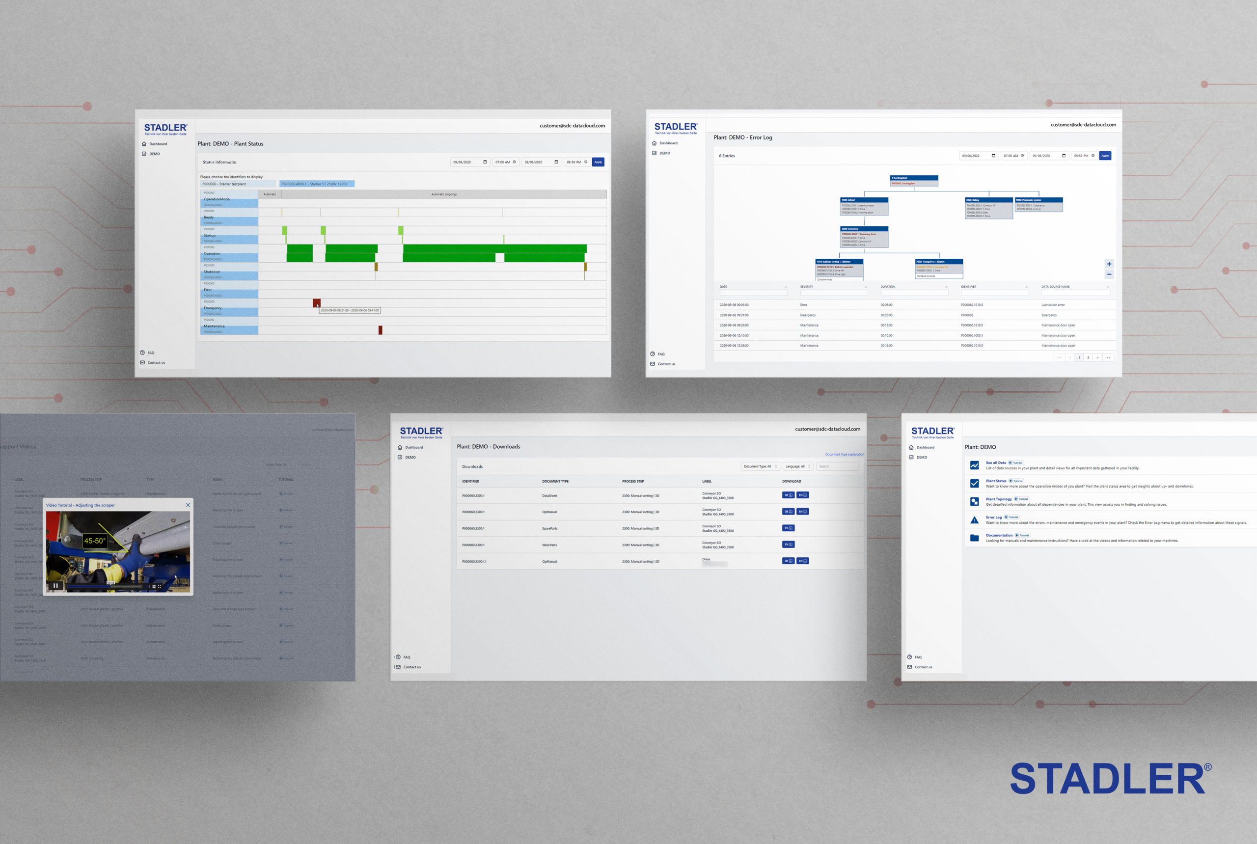 O SDC possui uma seção dedicada a proporcionar aos clientes acesso flexível a uma biblioteca completa de documentação de cada uma das máquinas de sua planta, para que esteja sempre atualizada. Eles incluem não apenas fichas técnicas e manuais de operação, mas também um catálogo de peças de reposição. Ao fazer um pedido, o cliente identificará facilmente a peça correta desejada através de sua fotografia, descrição e número da mesma no catálogo. A seção Documentação também oferece vídeos tutoriais preparados pela equipe de assistência técnica da STADLER, cobrindo as tarefas de manutenção normalmente realizadas pelo cliente.