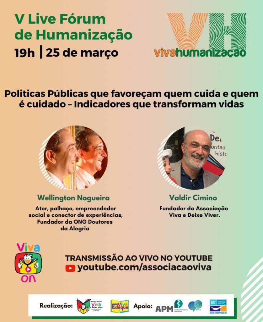 No próximo dia 25 de março, uma quinta-feira, às 19h, a Associação Viva e Deixe Viver (Viva), organização da sociedade civil (OSC) que congrega 1,3 mil voluntários responsáveis por contar histórias em 86 hospitais do País, vai promover o encontro de duas grandes referências no tema saúde humanizada: Wellington Nogueira, fundador da ONG Doutores da Alegria, e Valdir Cimino, fundador da Viva e Deixe Viver.