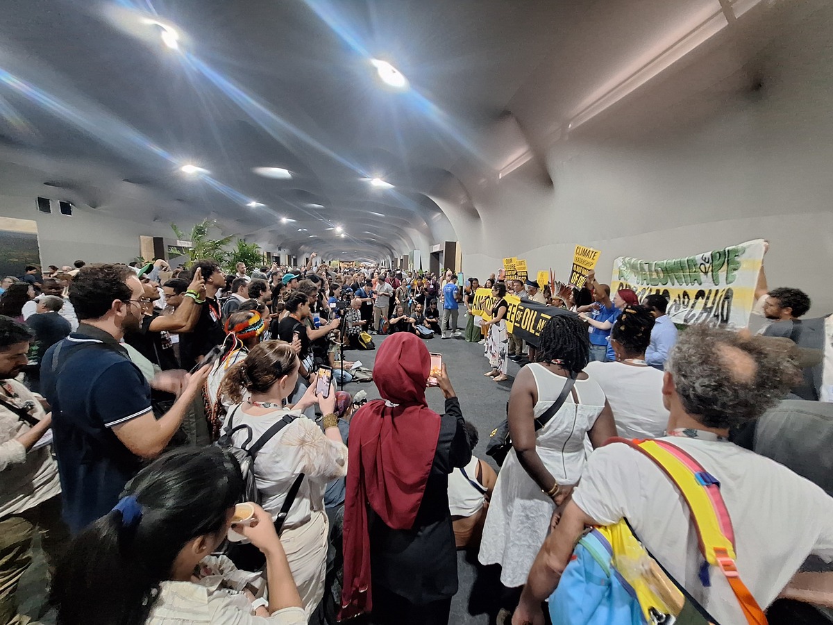 “Amazônia livre de petróleo e gás”, dizia, em inglês, uma grande faixa estendida pelos manifestantes no meio de um dos corredores da chamada “zona azul” – a área da conferência de acesso restrito aos credenciados, onde é realizada a negociação diplomática.