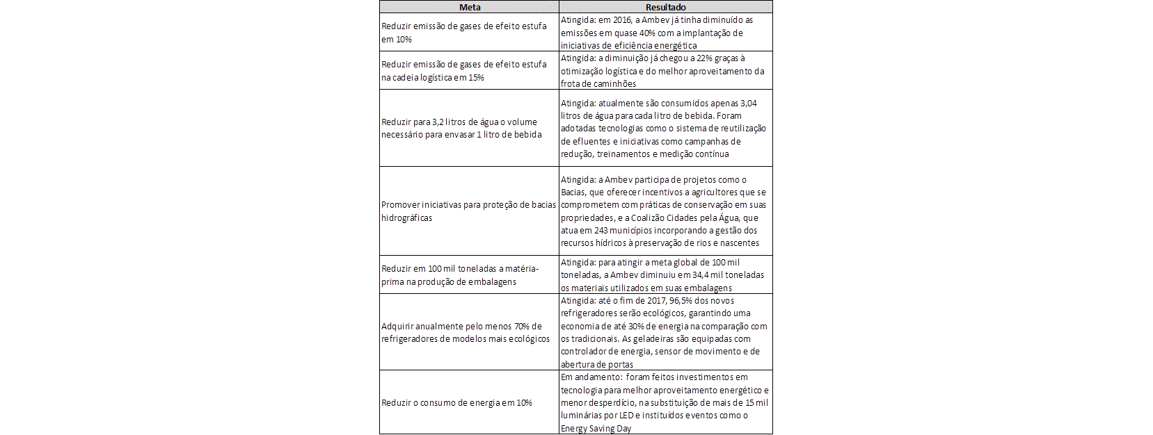 Entre as sete metas estabelecidas pela AB InBev, duas se relacionavam diretamente a esse tema e também foram batidas pela Ambev. Uma delas era reduzir para 3,2 litros de água o volume necessário para envasar 1 litro de bebida . No ano passado, já eram consumidos apenas 3,04 litros de água para cada litro de bebida.