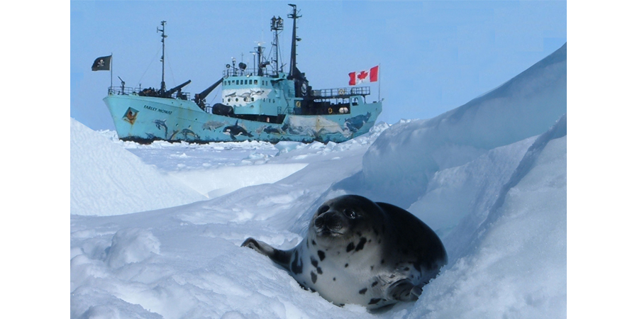 O navio do Sea Shepherd, Farley Mowat, no Golfo de St. Lawrence, litoral do Canadá, em oposição ao abate de focas. Nesta campanha, uma equipe da Sea Shepherd foi atacada e agredida violentamente quando estava no gelo tentando salvar os animais.