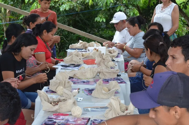 Thiago Franco, que integra a equipe da Iniciativa Estratégica de Governança Territorial do Idesam, explica que é realizado um assessoramento técnico junto às comunidades, desde a escrita de projetos até a execução das atividades, para que os participantes extraiam o máximo possível das experiências. No caso da oficina de artesanato, tudo foi organizado para que as artesãs se concentrassem no aprendizado e execução das novas técnicas de artesanato.
