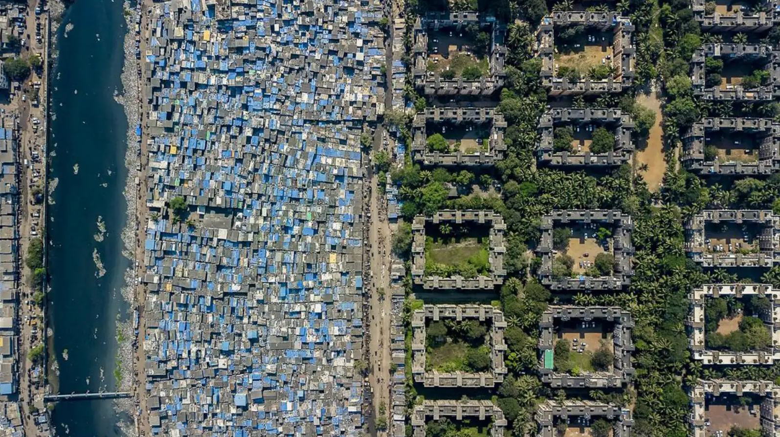 Imagem de destaque: Vista aérea de um setor da cidade indiana de Mumbai. Nos dias quentes, o assentamento informal de Dharavi (à esquerda) fica até seis graus mais quente do que os subúrbios vizinhos arborizados e mais bem construídos, um exemplo da relação entre desigualdade e alterações climáticas. Imagem: Johnny Miller/Oxfam