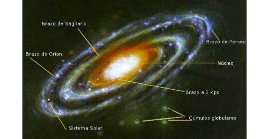 Nossa galáxia tem a forma de um disco achatado formado de estrelas e de gás. Como muitas galáxias, ela apresenta os tais “braços espirais” – estruturas espiraladas de matéria mais brilhante que contêm estrelas jovens e luminosas. As estrelas do disco galáctico giram em torno do centro da galáxia da mesma forma que os planetas giram em torno do Sol. O Sol não é diferente, e demora 200 milhões de anos para dar uma volta galáctica.