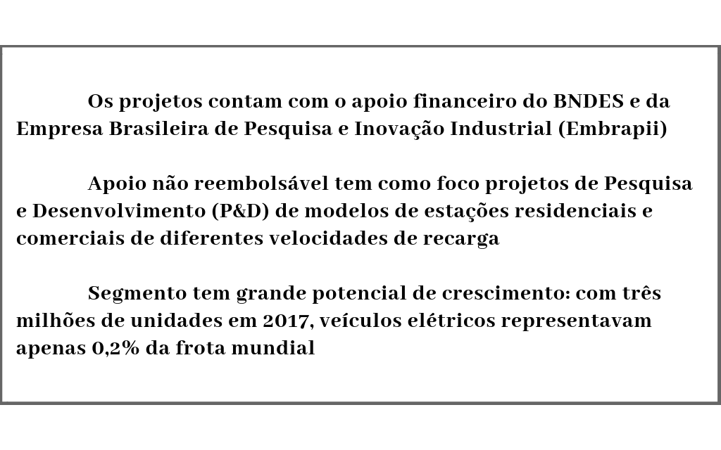 O Banco Nacional de Desenvolvimento Econômico e Social (BNDES) aprovou apoio de R$ 3,4 milhões e R$ 3,3 milhões para dois projetos de redes de recarga de veículos elétricos. Os recursos serão provenientes do BNDES Funtec, fundo não reembolsável voltado a projetos de pesquisa aplicada, desenvolvimento tecnológico e inovação. As iniciativas foram selecionadas em uma chamada pública realizada em 2016 e serão desenvolvidas por duas unidades da Empresa Brasileira de Pesquisa e Inovação Industrial (Embrapii): Fundação CPqD – Centro de Pesquisa e Desenvolvimento em Telecomunicações e a Fundação Centros de Referência em Tecnologias Inovadoras (CERTI).