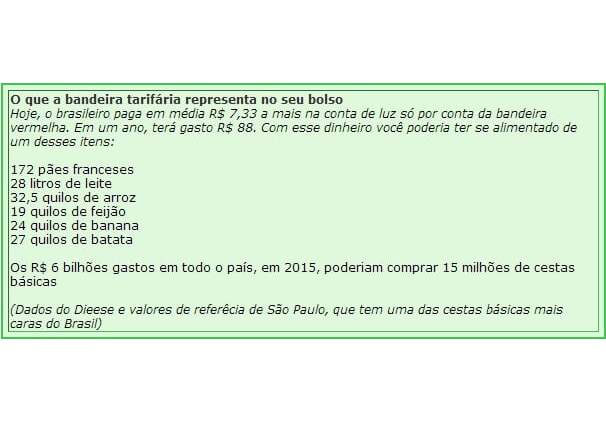 O valor da bandeira vermelha mudou ao longo do ano e atualmente custa R$ 0,045 por cada kWh consumidos. Parece pouco, mas significa que cada residência pagou em média R$ 7,33 a mais por mês na sua conta de luz. Ao ano, são R$ 88. Isso, sem considerar a tarifa de energia, que também aumentou, e os impostos incluídos na conta.