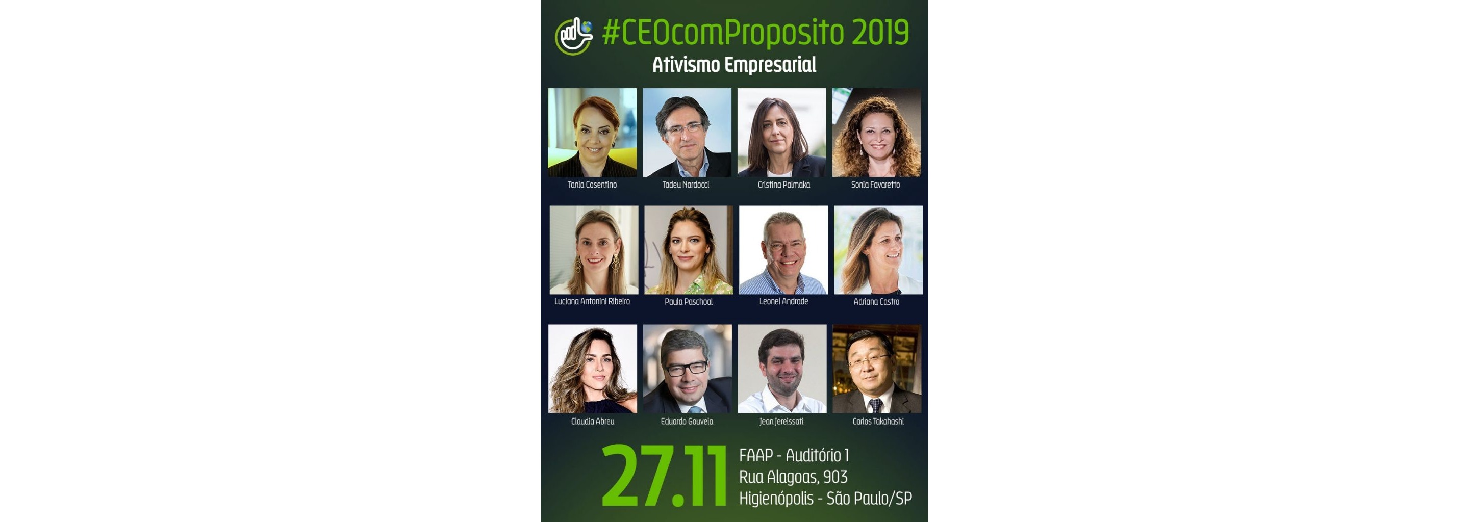 “A edição de 2019 do CEO com Propósito terá como abordagem central o ‘ativismo empresarial’ – e a ideia em torno dele é reunir CEOs de empresas que venham se destacando pela defesa de ideias, não necessariamente ligadas ao negócio, vistas como relevantes pelo conjunto da sociedade brasileira”.