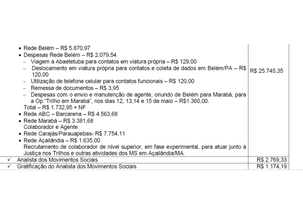 “Um exemplo de pedido direto (à Network) foi a infiltração de um agente no movimento Justiça nos Trilhos pelo Gerente Geral de Segurança Norte, Roberto Monteiro”, diz, mostrando um demonstrativo de junho de 2011 , com o pagamento total de R$247.807,74 a Network. Ali, na prestação de contas do Escritório Norte (Pará e Maranhão), no item “Rede Açailândia”, consta a despesa de R$ 1.635,00 referente ao “recrutamento de colaborador de nível superior, em fase experimental, para atuar junto à Justiça nos Trilhos e outras atividades dos MS (Movimentos Sociais) em Açailândia/Maranhão”.
