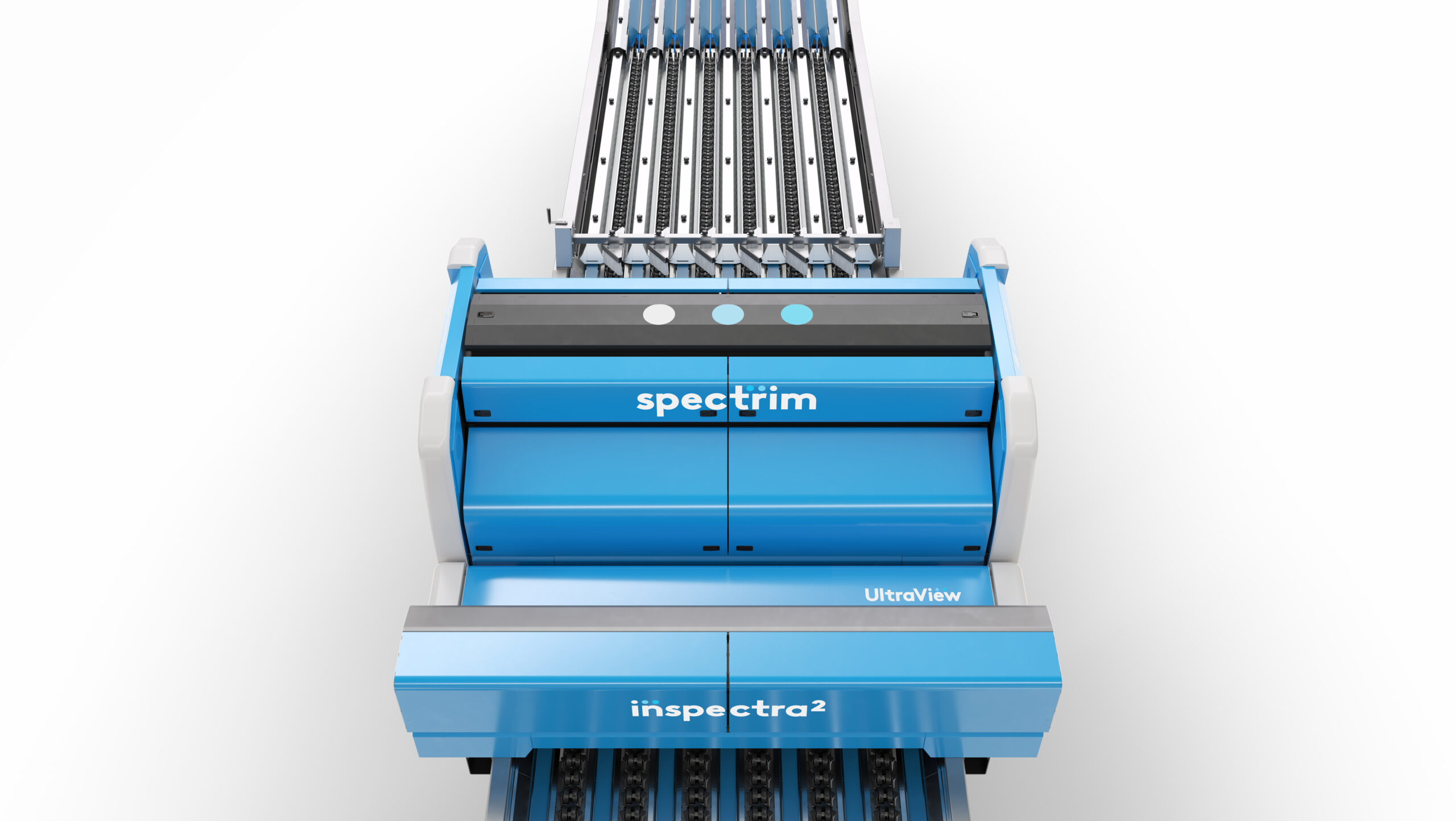 O módulo de inspeção UltraView se integra ao Spectrim para elevar seu poder e alcance de visão para o próximo nível. Com um conjunto dedicado de câmeras multiespectrais (coloridas e infravermelhas) de alta resolução e luzes LED localizadas perto da fruta da meneira ideal e paralelas à sua direção de deslocamento, esta é a plataforma de classificação de produtos frescos mais poderosa do mundo. O UltraView pode identificar defeitos que de outra forma seriam difíceis ou impossíveis de detetar nas regiões do cálice pedicelo da fruta.
