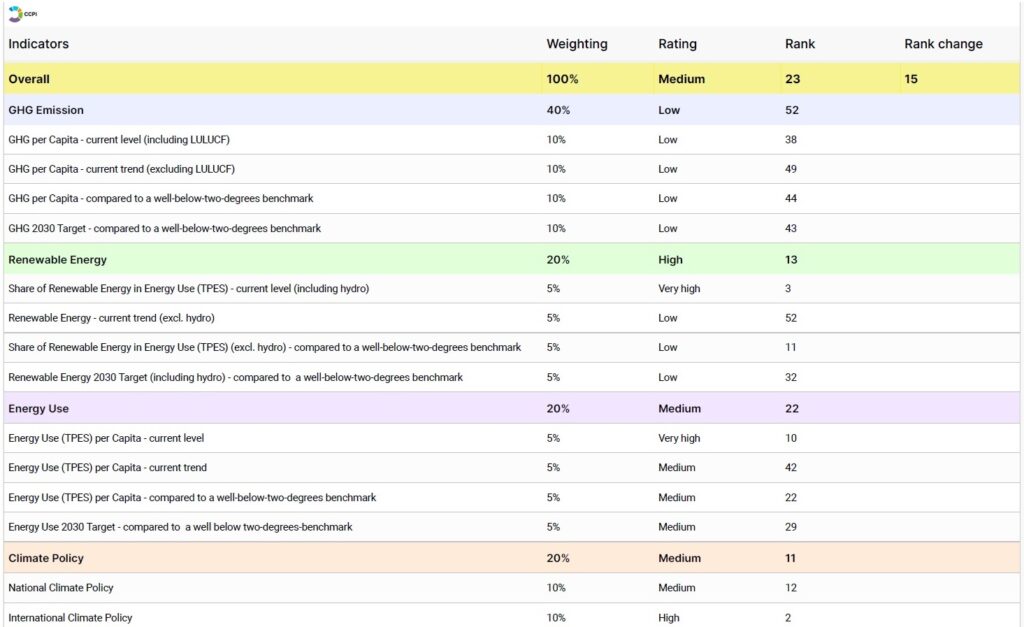 A performance brasileira no CCPI 2024 combina bons resultados na categoria que analisa fontes de energia renováveis com índices regulares em uso de energia e política climática e baixos em emissões de gases-estufa, como mostra a figura abaixo. A exploração e produção de combustíveis fósseis pelo país (e a intenção de expandi-la nos próximos anos) é citada na análise como um obstáculo e considerada incompatível com a meta de limitar o aquecimento do planeta a 1,5ºC acima dos níveis pré-industriais, como prevê o Acordo de Paris.