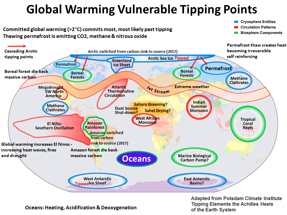 Os cientistas alertam para transformações nos sistemas climáticos em diversas partes do planeta. Os pontos de ruptura em maior risco incluem o colapso das plataformas de gelo na Groelândia e na Antártida, o degelo do permafrost , a morte de recifes de coral em águas quentes e o colapso de uma corrente oceânica no Atlântico Norte.