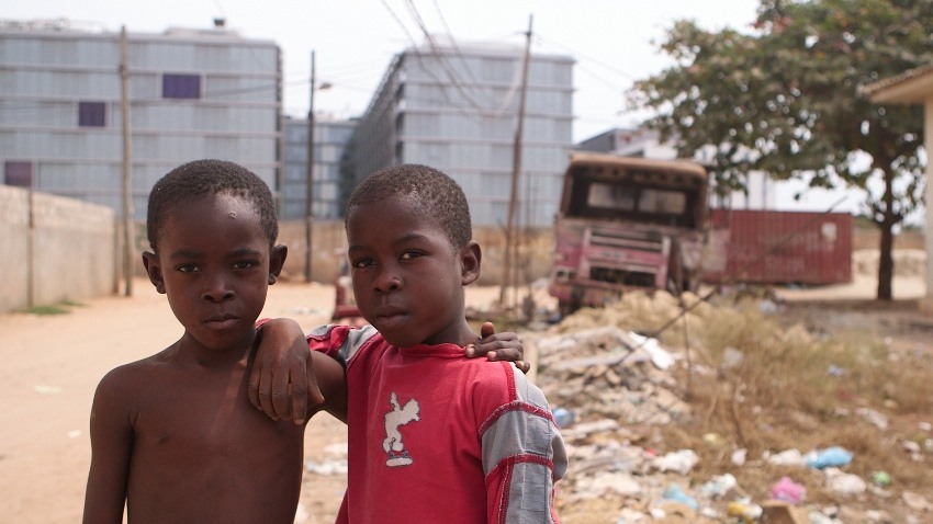 As ruas de terra e as casas envelhecidas contrastam com os prédios envidraçados, que sintetizam o que é o vistoso bairro de Talatona, separado apenas por um muro.