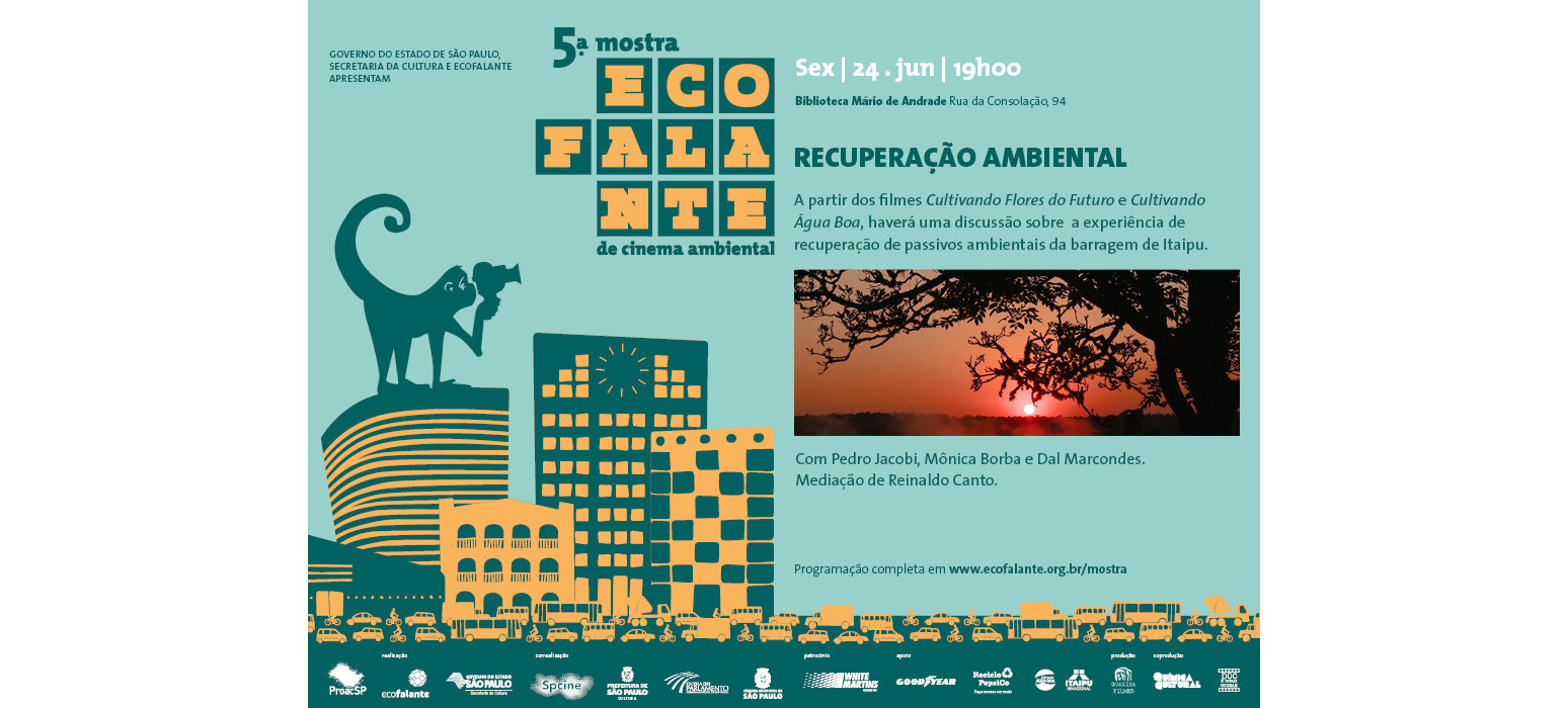 A partir dos filmes “Cultivando Flores do Futuro” e “Cultivando Água Boa”, exibidos às 19h, desta sexta-feira (24), na Biblioteca Mário de Andrade, Dal Marcondes – da Envolverde, Pedro Jacobi e Mônica Borba, discutirão experiências de recuperação ambiental, de referência mundial, em torno da barragem de Itaipu e na cidade de São Paulo.