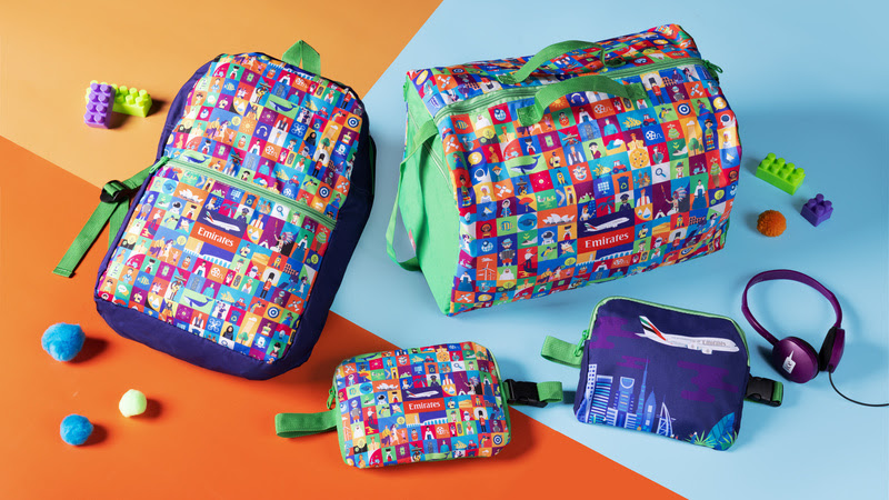 Para os consumidores mais jovens da Emirates, os sacos dos brinquedos, os kits para bebês e os brinquedos de pelúcia cortesia da companhia aérea também são feitos de garrafas plásticas recicladas e outros materiais sustentáveis. Pochetes, bolsas e mochilas são desenvolvidas pensando nesta faixa etária e produzidas com fio feito de garrafas plásticas 100% recicladas. Cada mochila infantil da Emirates é feita com 5,5 garrafas plásticas recicladas e cada bolsa é feita com 7 garrafas plásticas recicladas. A produção das bolsas infantis Emirates já deixou de enviar 8 milhões de garrafas plásticas para aterros. As etiquetas são feitas de cartão reciclado e as caixas em que os produtos são enviados são feitas de papelão reciclado, que pode ser reciclado novamente.