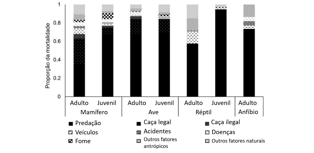 Os pesquisadores buscaram por estudos de 1970 a 2018 referentes a todos os grupos taxonômicos de vertebrados. O resultado foi 1.114 trabalhos. Desses, foram documentadas 42.755 mortes com causas conhecidas, das quais 28% eram relativas a atividades humanas e 72% a causas naturais. A maior causa de mortalidade foi a predação com 55% dos animais, seguido pela caça legal com 17%. As outras causas, como atropelamento, caça ilegal, fome, doenças e acidentes, somaram menos de 10% do total da mortalidade.