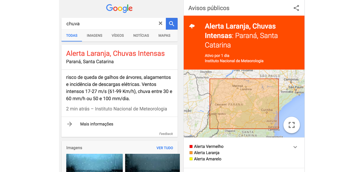 São Paulo, julho de 2016 – Frequentemente, a vida de milhões de brasileiros é afetada por tempestades, alagamentos, geadas e outros fenômenos meteorológicos. Em situações de crise, é crucial localizar informações sobre como lidar com essas emergências de forma rápida e efetiva. É por essa razão que o Google está lançando hoje, em parceria com o Ministério da Integração Nacional e o Ministério da Agricultura, Pecuária e Abastecimento, o serviço de Avisos Públicos, uma plataforma online que informa a população sobre a ocorrência de eventos meteorológicos utilizando o Google Now, o Google Maps e a página da Busca.