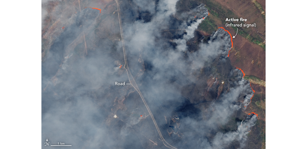 As imagens de labaredas em Amur Oblast foram capturadas pelo Landsat 8 em 7 de maio de 2018. Os dados de cor natural ( bandas 4–3–2) são sobrepostos com dados infravermelhos (bandas 6 e 5) para revelar pontos quentes ainda em chamas.