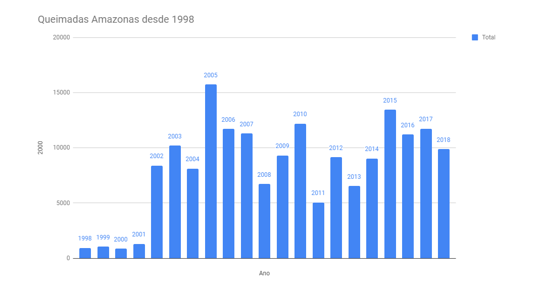 A série histórica que começa em 1998 mostra que o número de queimadas no Amazonas deu um salto a partir da virada do século, até atingir o recorde em 2005, com 15.733 focos registrados. Depois de diminuir durante alguns anos, voltou a aumentar até chegar a segunda maior marca, em 2015. Desde então, o número de registros tem ficado sempre acima dos 10 mil por ano.