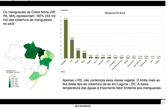 Entre as formações naturais sobre as quais o mangue se expande estão os apicuns – superfícies dinâmicas, hipersalinas e associadas ao regime de marés. Entre 1985 e 2021, os apicuns passaram de 57 mil para 54 mil hectares de área no Brasil. O Maranhão concentra aproximadamente 60% da superfície de apicuns do país.