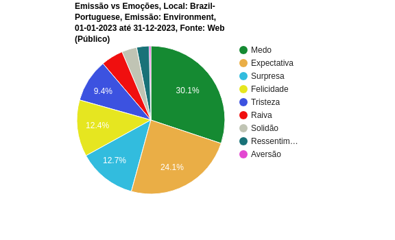 Tanto nas conversas na Web (públicas) como na média das notícias de 30 dias, o medo ocupou o primeiro lugar no clima emocional do ano quando o assunto foi o meio ambiente; já a expectativa ocupou o segundo lugar nas conversas online; a surpresa ficou um pouco atrás, como a segunda emoção mais registrada nas notícias.