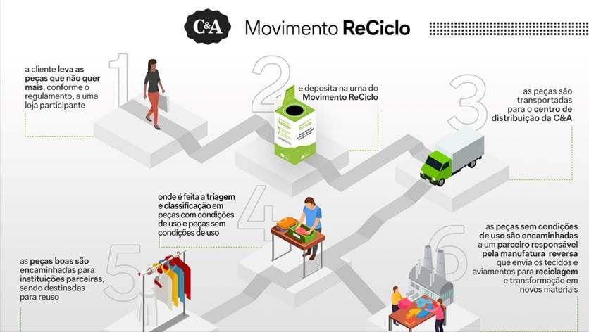 De acordo com a Associação Brasileira da Indústria Têxtil e da Confecção (Abit), todos os anos, cerca de 170 mil toneladas de resíduos têxteis são descartadas de forma incorreta no lixo comum. “O volume de descarte de peças usadas é enorme no país e trabalhamos cada vez mais nos processos de confecção, produção e no fim de uso para mudar essa realidade. A existência do Movimento ReCiclo nos ajuda a cumprir com nossa missão de oferecer uma moda mais positiva para nossas clientes e para a sociedade como um todo”, destaca Cyntia Kasai, gerente-executiva de ASG na C&A.
