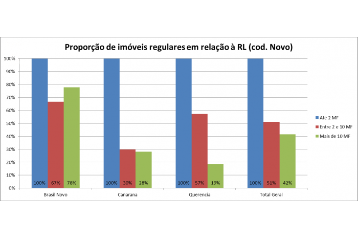 No caso da RL, a nova lei promoveu uma anistia de 97,3 mil hectares nos três municípios, o que corresponde a uma redução em torno de 20% do passivo anterior. Nas propriedades até dois módulos, com o novo Código todos os produtores estão regularizados. No antigo, eles eram apenas 16%. Até 10 módulos fiscais, a regularização passou de 16% para 51%. A regularização em relação à RL nas grandes propriedades passou de 39% para 42%.