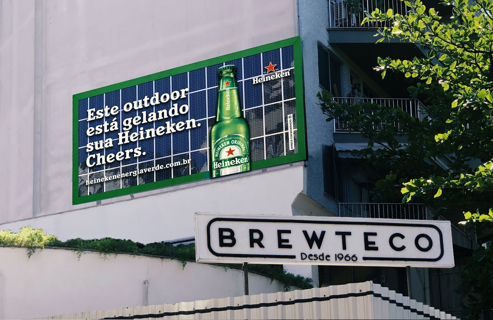 A empresa instalou painéis solares em um outdoor conectado ao Brewteco, famoso bar carioca localizado na Gávea. Criada pela agência Le Pub, do grupo Publicis, a ação reforça, como um gesto simbólico, a campanha da Heineken®, cujo objetivo é chamar a atenção para a utilização de fontes renováveis de energia. O projeto também visa destacar o Programa Heineken Energia Verde, destinado a facilitar o acesso à Energia Verde para consumidores de todo o país.