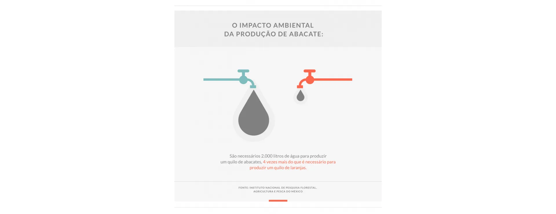 No Chile, o problema mais grave atualmente é da água. Na província de Petorca, uma zona de produção de abacate, os rios secaram. São usados 2.000 litros de água para produzir um quilo de abacate, quatro vezes a quantidade usada para a produção de um quilo de laranjas, de acordo com o Instituto Nacional de Pesquisa Florestal, Agricultura e Pesca do México.