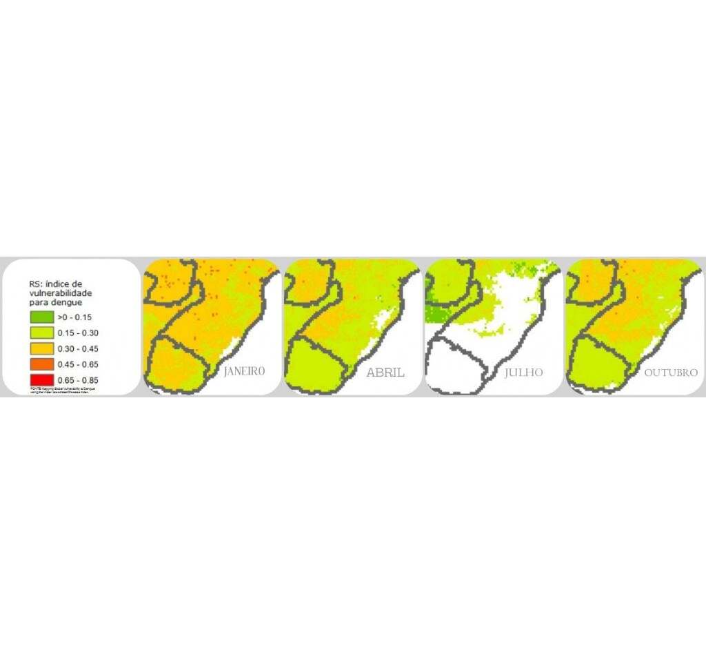A pesquisa analisa quatro cenários diferentes, de acordo com os meses de janeiro, abril, julho e outubro. No que se refere ao Rio Grande do Sul, fica claro que algumas épocas do ano são mais propicias para a exposição do mosquito – já que a região é dotada de condições climáticas sazonais. Janeiro se mostra o mês de maior vulnerabilidade devido ao calor provocado pelo verão (foto abaixo). O Noroeste, por ser a região mais quente do Estado, é a área mais suscetível. Foi lá que a Secretaria de Saúde reconheceu um surto da dengue neste ano.