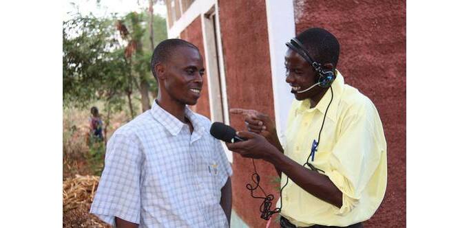 Festus Kaleli, da Rádio Mang’elete, entrevista um jovem agricultor no distrito de Nthongoni, na região de Makueni, no Quênia. Foto: Isaiah Esipisu/IPS