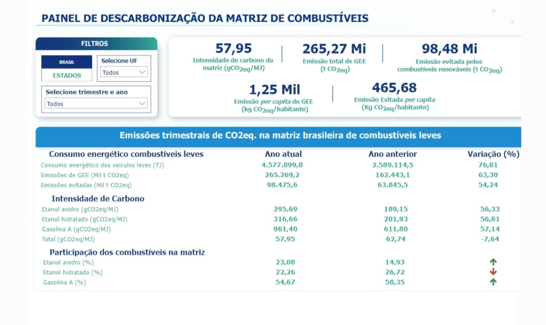 O relatório mostra ainda que apesar do ganho de eficiência energético-ambiental dos biocombustíveis, a intensidade média da matriz de combustíveis leves (emissões de GEE da gasolina e etanol) apresentou piora de 0,74% no terceiro trimestre de 2022. Com efeito, a IC da matriz de combustíveis leves alcançou 65,62 gCO2eq/MJ no trimestre deste ano, ante 65,14 gCO2eq/MJ no mesmo período do ano passado.
